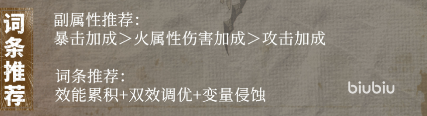 为了最大化赤痕的输出潜力,技能使用需频繁触发暴击效果,因此在词条选择上应优先考虑“调优”与“连锁破坏”两类增益属性。副属性方面,暴击率应列为首选,以确保高频暴击带来的伤害飞跃;其次推荐堆叠火属性伤害加成,进一步放大其元素特性的攻击优势。