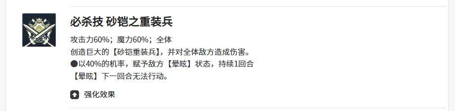 第二个技能为砂铠之哨兵,拥有每三回合一次的释放频率,攻击力与魔力值均可达110%,同样是针对单一敌人的强力打击技。除了高额伤害外,该技能还有50%概率使目标陷入晕眩状态,持续一回合。这意味着成功命中后可有效打断对手的关键技能释放节奏,在PVP或高难度副本中具备重要战略意义。