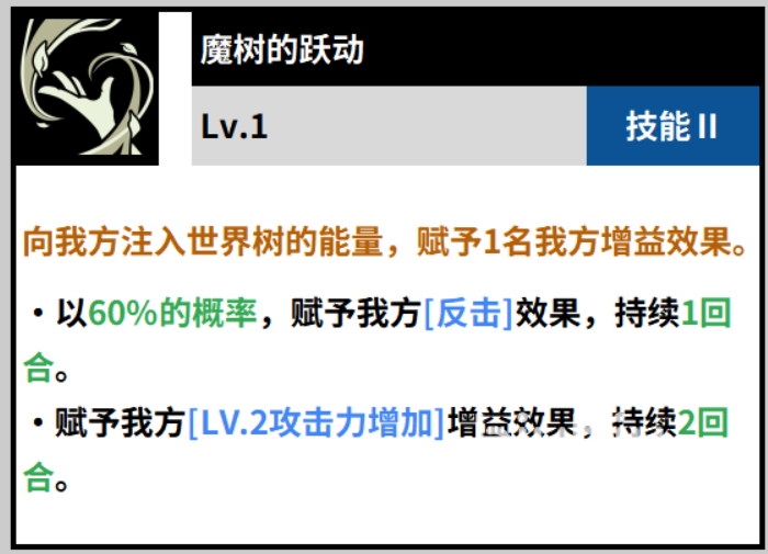 威廉凡金斯在战斗中的核心定位是团队支援者,其技能机制主要围绕增益效果展开,能够显著提升队友的作战能力。他的第一个技能名为“卷曲的大树之根”,该技能以单体敌人为目标造成伤害,并有40%的概率附加“变异”状态。该状态一旦触发,目标将在一个回合内陷入树根束缚,无法执行任何行动或释放技能,属于强力的控制效果。随着技能等级提升,该概率还可进一步增强,使其控制能力更加稳定。