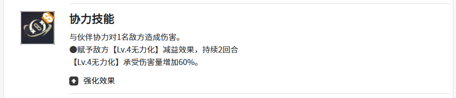 协力技能方面,内布拉可在与队友配合时对敌方单体发动一次辅助性攻击,虽然伤害较低,但能附加“无力化”减益效果,使目标所受伤害提升60%,持续两个回合。这一机制使得她在团队配合中具备良好的控场价值,尤其适合搭配高爆发角色形成连携压制。