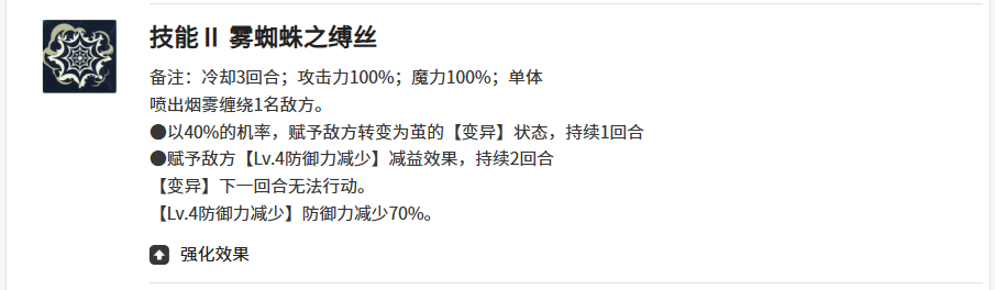 第二个技能“雾蜘蛛之缚丝”具有三回合冷却时间,基础伤害倍率高达100%,同样作用于单体目标。发动时,内布拉会喷出烟雾缠绕敌人,有40%概率使目标陷入变异状态,即被包裹成茧状,在接下来的一个回合内完全无法行动。与此同时,该技能还会以防御力最低的敌人为对象,施加一个降低其70%防御力的效果,此削弱状态可持续两个回合,极大提升了我方后续输出角色的打击效率。