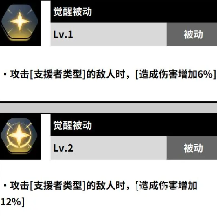 戈登还配备了一个觉醒类被动技能,专门针对支援型敌人设计。当他对这类角色发起攻击时,可额外提升6%的伤害;该被动升至2级后,增伤幅度提升至12%,进一步增强了他在对抗辅助单位时的威胁性。
