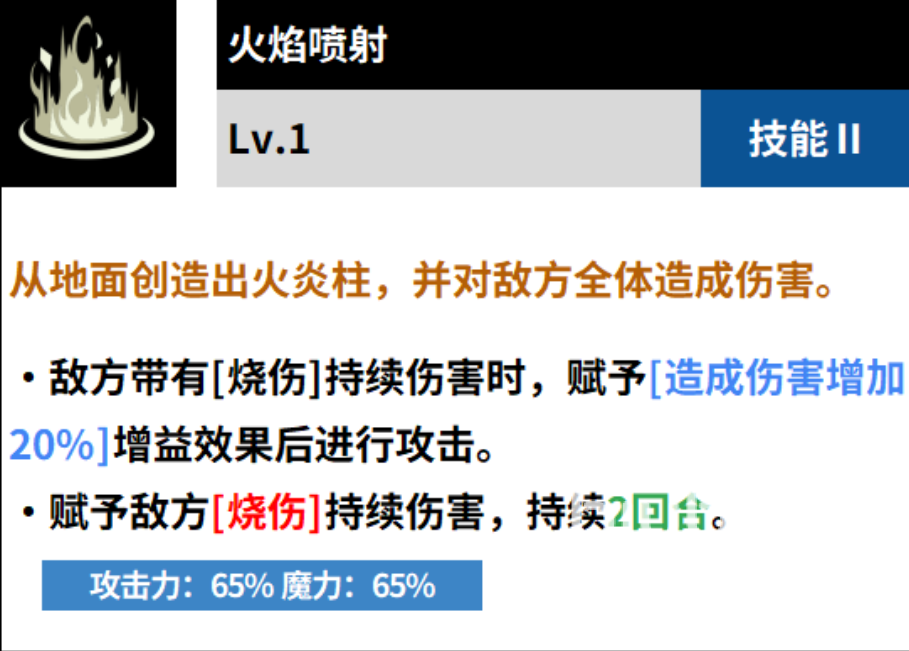 第二个技能为火焰喷射,可从地面召唤出多道烈焰柱攻击全体敌方单位。若目标已处于烧伤状态,则此技能将额外提升20%伤害,并延续烧伤效果,确保持续压制对手。该技能的基础攻击力与魔力倍率为65%。