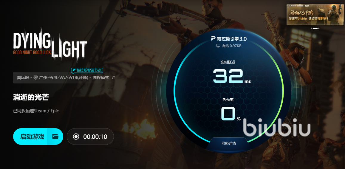 好了,上述便是消逝的光芒配置够但是却严重掉帧的全部说明了,对于广大玩家而言,到时有遇到延迟很高,动不动就发生卡顿等问题,那么去打开biubiu来帮自己进一步稳定也是很重要的,各位近期对于此有想法,那么就抓紧去进入试试吧。