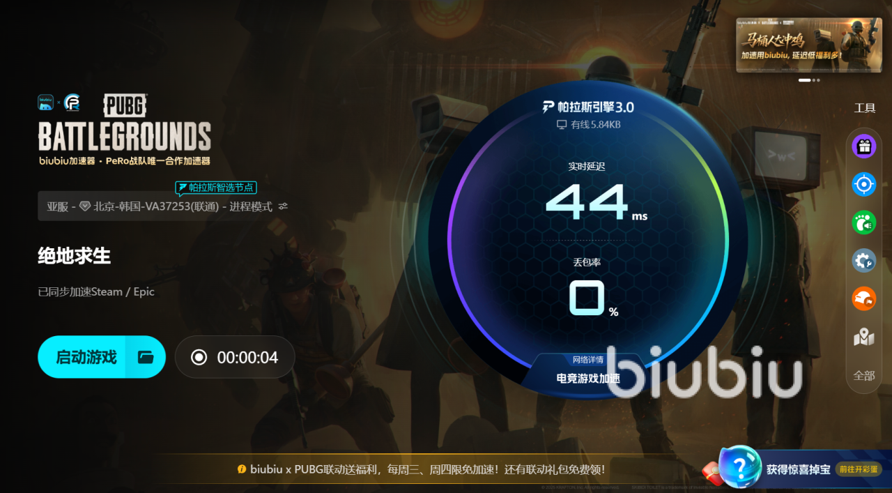 操作流程其实很省事。打开biubiu客户端,搜索pubg找到专属加速入口,点开启加速就行,系统会自己测当前网络状态,把线路压到延迟最低、抖动最小的那个节点上,全程不需要手动挑线也不用去试哪个区快。加速保持开启后再进游戏,大厅、匹配、地图加载都会顺起来。如果遇到的是晚高峰、赛季更新这种极端时段,也可以在专属页里换一下节点做补强,但默认智能选线就能应付大多数情况。