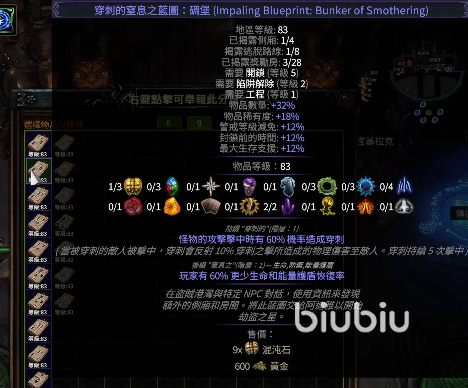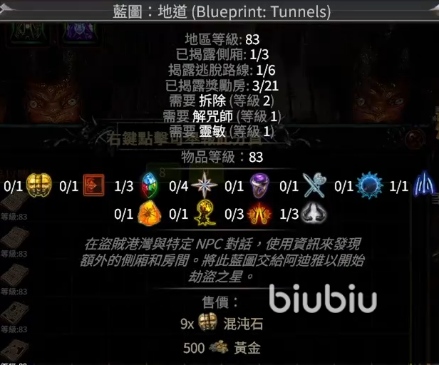 蓝图选择:83物等的蓝图奖励最好。优先选择通货、精华、命运卡奖励类型的房间。
