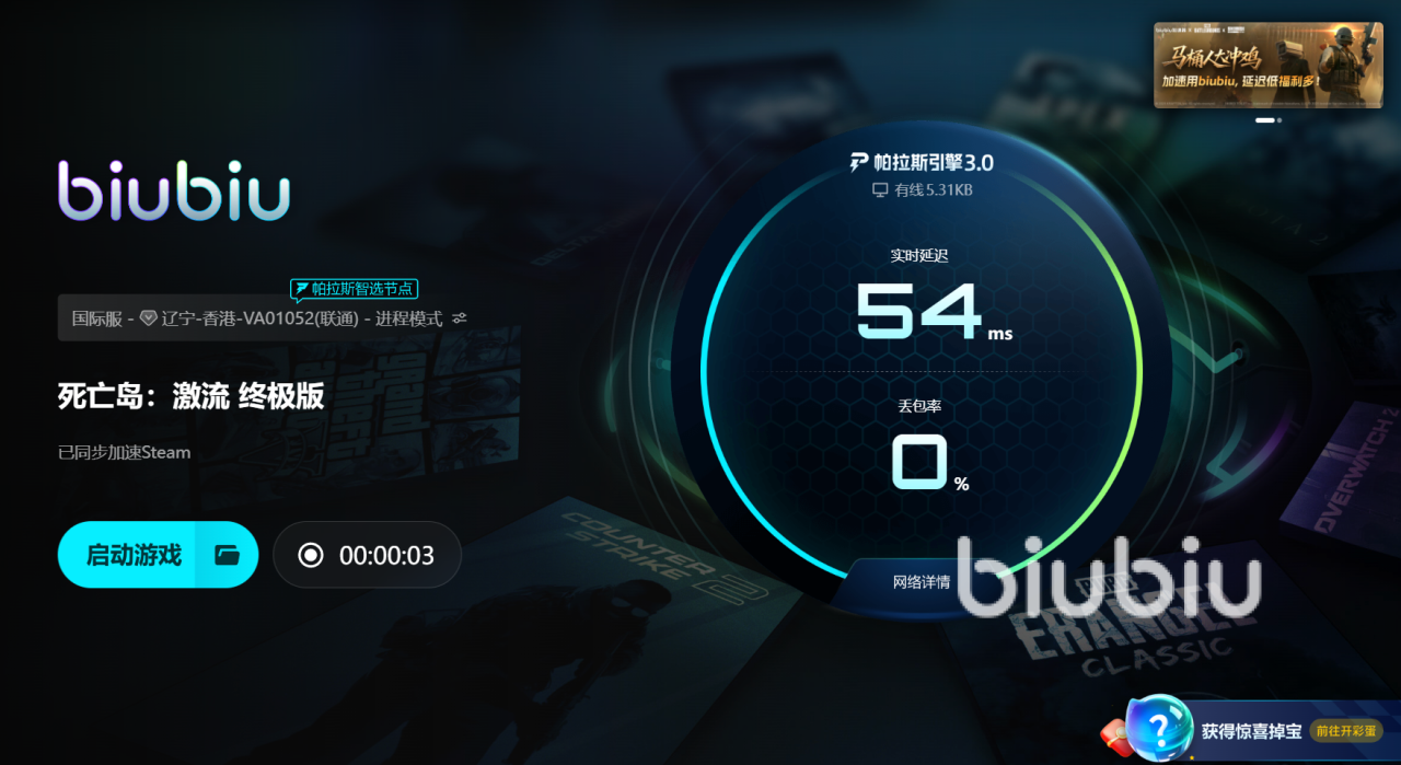 打开biubiu加速器,搜索死亡岛激流终极版,选择游戏图标并点击立即加速。几秒钟后系统会显示网络优化完成,你无需调整其他设置,直接启动游戏。进入战斗、加载地图、触发剧情时,你会明显感受到——画面不再突然黑屏,节奏不再被强行打断。