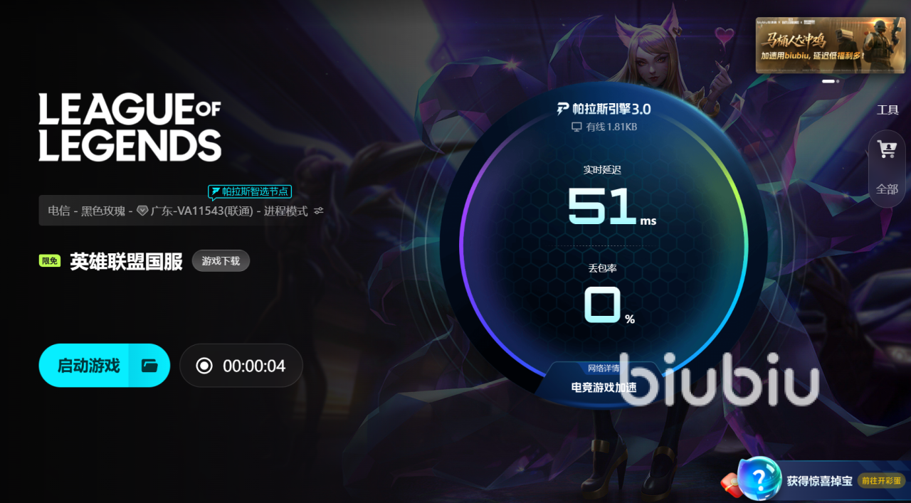 操作流程也不复杂。打开biubiu,搜索英雄联盟,选择LOL专属加速节点后开启,加速器会自动检测当前网络状态并给到延迟更低的线路,不需要自己去调端口、换DNS。回到客户端重新进游戏,读图会更顺,皮肤、头像、战利品这些小资源能更快拉完,先进训练营走两圈、放两套技能,就能感觉掉帧点被压下去。