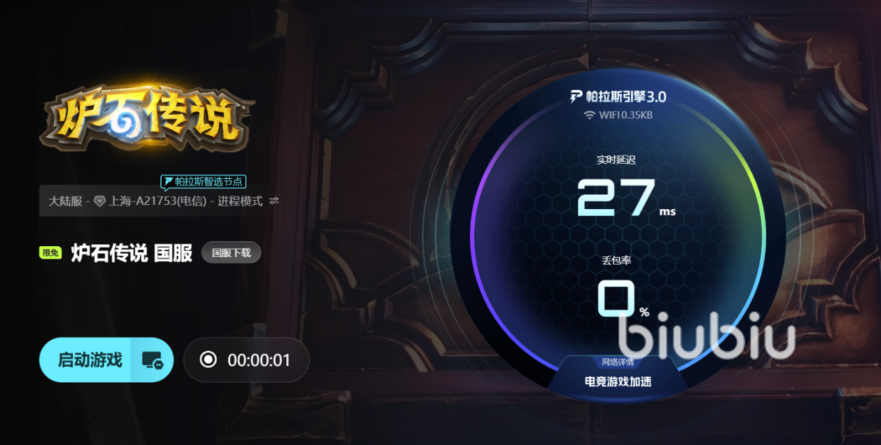为了让大家能够安心冲分,biubiu为所有用户准备了实用福利,现在带着【biubiu不卡顿】,这句口令就能够直接领取到三天的会员免费体验时间。如果你是第一次使用的新用户,那么在注册登录之后,还能得到平台赠送的24h免费加速时间;总计长达4天。这段时间足以覆盖周末冲分黄金期,让你无需担忧网络意外,专注提升段位。整个加速过程也极为简便:打开biubiu,搜索“炉石传说”,一键加速,系统自动完成节点匹配与后台优化,无需手动设置,即刻享受稳定连接。