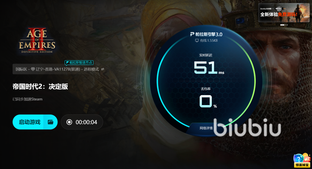 操作流程很直接打开biubiu搜索帝国时代2,选择对应游戏图标,点击加速,开启后系统自动体检链路并匹配更稳节点,无需改端口与参数,前台返回游戏即可继续读条,后台运行轻量对帧率与CPU占用干扰可忽略。
