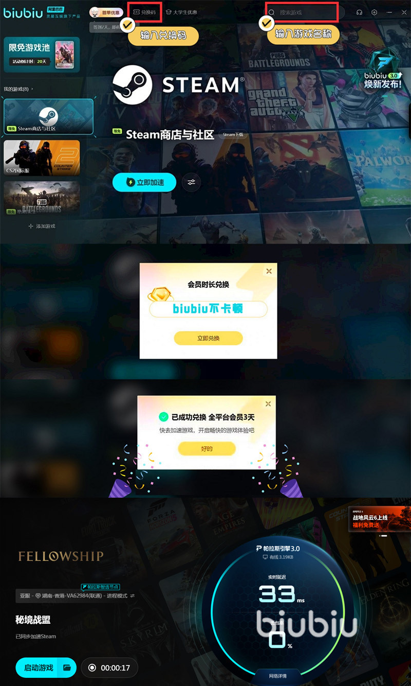 秘境战盟战斗场景多,为了画面效果,玩家要安装好加速工具。biubiu支持一键加速,搜索对应的游戏进行加速,优化网络节点布局。biubiu全新升级,同冠军选手Aixleft联合打造,添加帕拉斯引擎3.0。biubiu早已提出免费试用计划。新人首次注册送24小时免费加速;新老用户输入兑换码【biubiu不卡顿】送72小时免费加速。