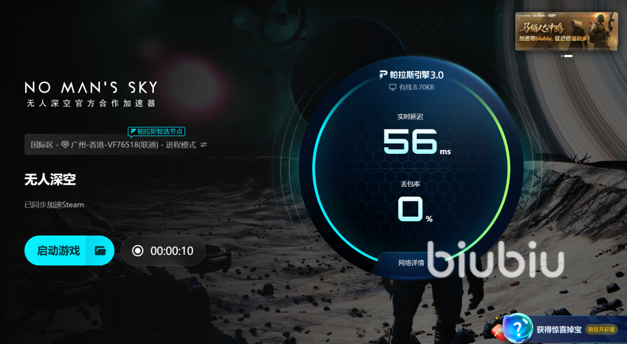 浩瀚宇宙本应触手可及,但通往它的入口必须坚固且稳定。《无人深空》的魅力不仅在于其近乎无限的星系数量,更在于每一次启动都是一段全新旅程的起点。借助biubiu加速器,你的飞船将真正点燃推进系统,让探索之旅不再被技术问题打断,让你与遥远星辰之间,只剩一次顺畅的加载等待。进度条平稳推进,光帆扬起,星图缓缓展开,未知与期待一同降临。坐进驾驶座,按下点火键,推进器由暗红转为炽白,航迹划出一道纯净光痕,寂静的深空仿佛被温柔撕开,前方的路从幽暗走向光明。