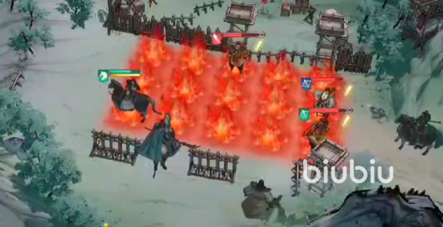 清除外围守军后,安排曹洪驻守侧方山道,防止残敌逃逸或援军增援。随后由吕玲绮与曹操分两路突入营寨内部。进入据点时注意站位控制,确保曹操触发纵火技能,一次性波及三名防守单位。火焰效果可持续两回合,期间右侧由曹操集中火力攻击孤立目标,左侧则由关羽与吕玲绮联手围攻,合理规划可在吕玲绮血量降至半血前完成两次围攻输出。第三回合起,关羽利用机动优势迂回追击被曹洪拦截的残血敌军,借助再动机制重返营寨,终结最后一名守军,顺利完成清剿任务。