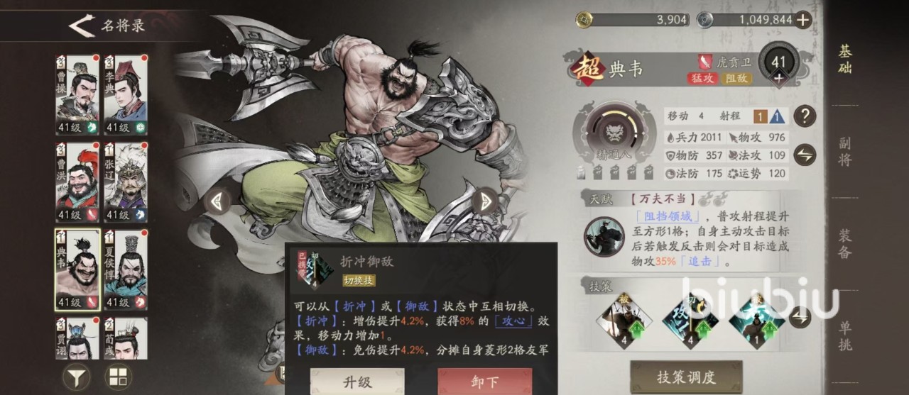 典韦的核心玩法在于其独有的形态切换技能,可在“折冲”与“御敌”两种状态之间自由转换。当处于折冲状态时,典韦的攻击力得到提升,并有一定几率触发攻心效果,同时移动力增加1点,适合用于快速切入战场进行输出。而切换至御敌状态后,他的免伤率提高,并能分摊周围菱形两格内友军所受的部分伤害,极大增强了团队的生存能力。
