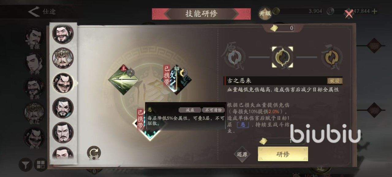 当角色等级达到40级后,典韦将解锁更深层次的战斗能力——生命值降低时获得减伤效果,同时可削弱敌方全属性。该能力在研修达到一级后可持续整场战斗,每层提供5%的削弱效果,最多叠加三层,即最高可减少敌方15%的全属性。这一被动极大地限制了对手的整体战斗力,尤其在持久战中优势明显。