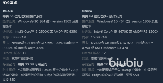 作战平台需基于64位架构的处理器与操作系统,Windows® 10(64 位)版本1909或以上。处理核心则需Intel® Core™ i5-2500K或AMD™ FX-8350,战场地图需预装8GB RAM。视觉冲锋则需显卡NVIDIA® GeForce® GTX 660、AMD Radeon™ R9 280或Intel® Arc™ A380;DirectX 12的支持必不可少。最后,还需为游戏本体预留约90GB存储空间,在战前务必清理战备库,这场旅途不会轻松。