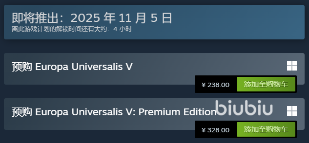 欧陆风云5于2025年11月5日正式上线PC平台,具体上线平台为Steam。标准版售价为238元人民币,为钟情于纯粹国家管理与沙盘推演的核心玩家提供了最本真的策略体验。追求极致深度与完整体验的话,328元的豪华版无疑是更具价值的选择,额外包含3个深入剖析特定时代与国家命运的剧情扩展包DLC、8个大型地理区域扩充包、海量专属角色外观包以及沉浸式游戏背景包,内容丰富度与性价比远超标准版。