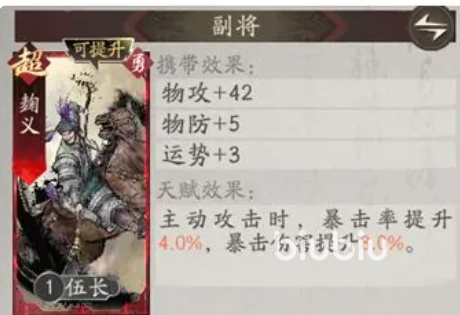 装备配置方面,前期应优先选择带有攻击力加成的部件,以快速建立输出基础。受限于当前阶段可选装备较少,实际战力更多依赖副将系统补足。鉴于夏侯渊依赖暴击机制,推荐搭配具备相关属性加成的辅助武将。例如武安国虽为蓝卡品质,但属性契合度高且获取简单,适合作为过渡期搭档使用。