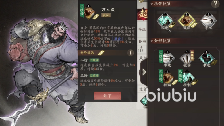 另一项核心被动名为“万人敌”,作用范围为自身周围一圈。当周围无队友提供增益时,张飞自动获得15%物防加成。此外,在自身行动结束后,可对范围内及移动路径上的所有敌军造成相当于其物攻50%的追加伤害,类似追击机制。这一被动不仅强化输出,也进一步提升了他在前线的抗压能力。
