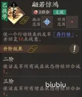 在基础一阶状态下,貂蝉释放单体计策时,能为友军带来20%的能力提升,并额外恢复10点战意值。这一机制使她在回合制节奏中具备良好的续航能力。她的核心主动技能“翩若惊鸿”允许一名队友再次行动一次,极大增强了团队的操作灵活性。随着技能等级提升,该技能不仅能延长增益状态的持续时间,在特定条件下还能削弱敌方单位,使其减少一次行动机会,是貂蝉必须携带的关键技能。