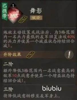 在通用技能的选择上,貂蝉并无过多限制,但建议优先补充单体治疗类技能以应对技能真空期。推荐搭配“舞影”与“沉鱼落雁”两个关键技能。“舞影”可在貂蝉使用任意技能后触发一次群体治疗(俗称WiFi奶),同时缩短我方负面状态的持续时间;技能升级后还可降低敌方战意并清除其正面增益效果,兼具控场与支援功能。