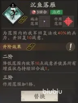 至于“沉鱼落雁”,该技能建议在貂蝉达到五星后再进行装配。未达五星时,难以激活其完整效果,且冷却时间较长、回血量一般。然而,其核心优势在于战意恢复,并能在升级后扩大作用范围,对敌方造成战意削减。因此,一旦貂蝉星级达标,此技能将成为不可或缺的战略配置。
