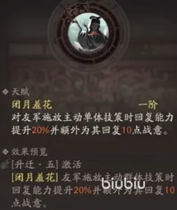 貂蝉的核心天赋名为“闭月羞花”,该技能在战斗初始阶段即可为己方单体单位提供恢复效果,有效缓解前期战力不足的问题。当她升至五星时,此天赋可进一步增强群体技能的附加效果;若达到满星状态,技能整体效果还将获得百分比提升。因此,貂蝉在星级达标后,其辅助价值将显著提升,尤其适合需要频繁释放计策的阵容体系。