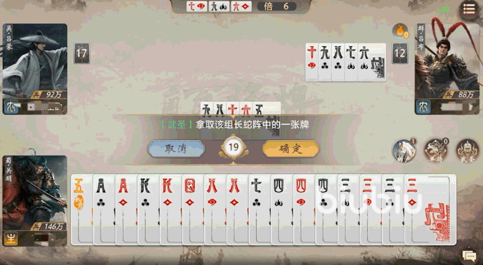 关羽是擅长获取额外资源的武将,尤其针对顺子类牌型。他拥有“单骑”与“武圣”两项技能。“单骑”允许他在自己打出“长蛇阵”(即点数连续的牌)时,额外获得一张万能牌;而“武圣”则可在其他角色出“长蛇阵容”时,从中任选一张牌加入手牌,增强控场与补牌能力。
