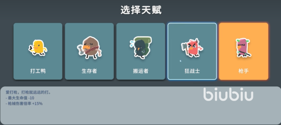 枪手:专精远程火力输出,枪械伤害提升15%,但代价是最大生命值降低10点,考验操作与走位技巧。