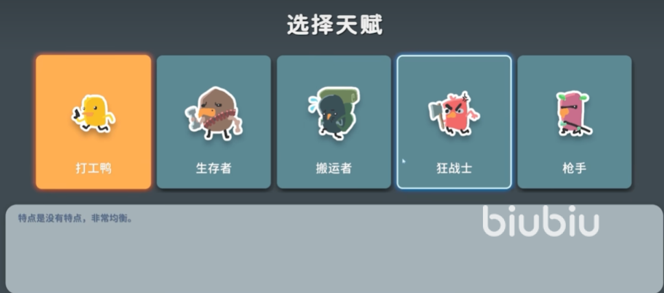 打工鸭:基础属性全面平衡,无任何增益或削弱效果,适合新手熟悉机制,是万金油型角色。