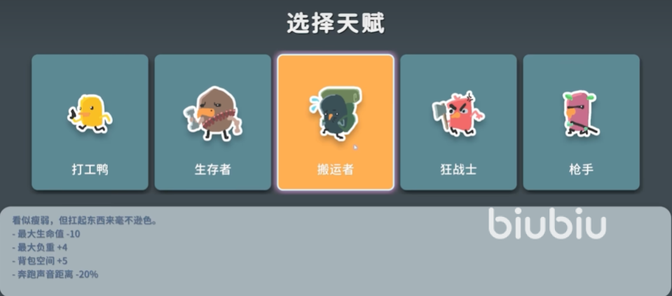 搬运者:虽然生命值减少15%,但具备更强的携带能力,最大负重提升10单位,背包格子额外增加5个,唯一缺点是奔跑时发出的声音传播距离减少20%,需注意隐蔽性。