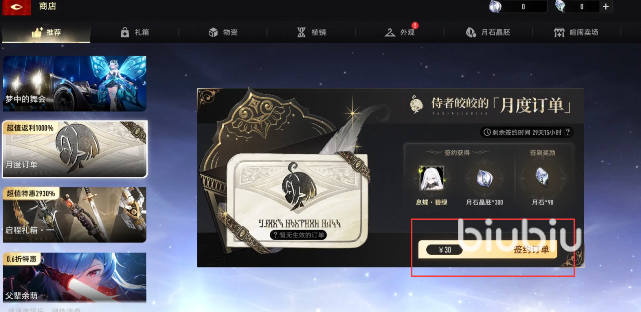 第二类是资源型付费项目,包括月卡、战令以及启辰礼包。购买月卡后,玩家可立即获得300月石晶胚和“息碟.碧绿”道具,此后每日签到还可额外领取90月石晶胚,在有效期内总计可收获不少于3000个月石晶胚,长期收益可观。