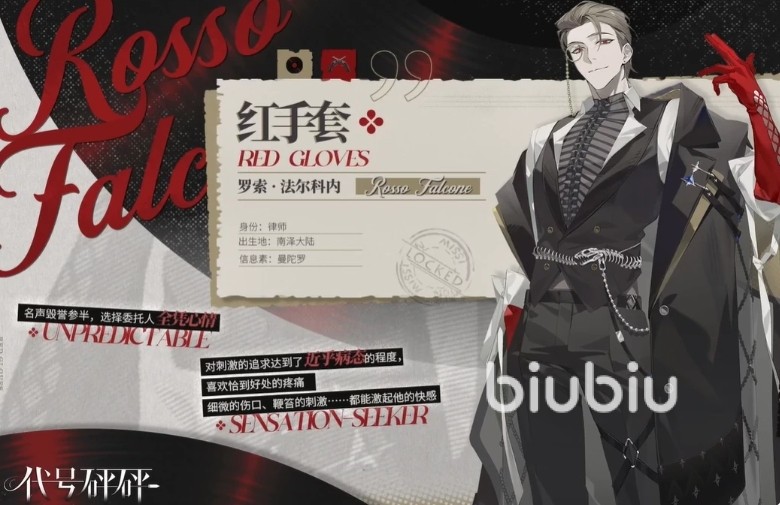 最后要介绍的是红手套这一标志性角色。凭借醒目的红色手套与同色瞳孔,他在众多角色中辨识度极高。外表看似精英干练,实则性格中带有强烈的癫狂倾向。他偏好高强度刺激的场景,因此出场剧情往往充满张力与冲突。对于新手而言,他是最容易获得的初始角色之一,可通过免费途径直接获取其卡牌。在战斗体系中,他通常部署于控制位,拥有使敌人陷入眩晕状态的能力,并附加减伤压制效果,实战中的功能性与强度均属上乘。