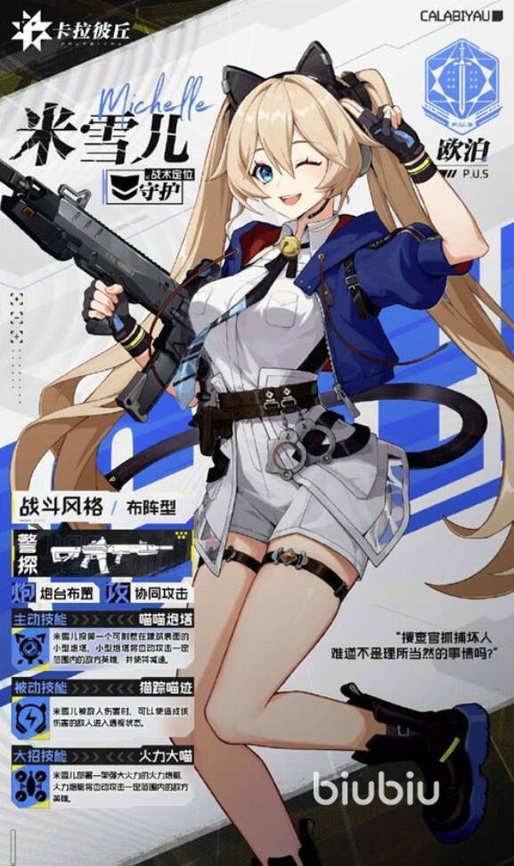 性格活泼的米雪儿在游戏中热衷于收集徽章、猫咪相关物品以及各类游戏周边。她的目标是追随父亲的脚步,与伙伴“火力大喵”并肩作战。这一设定也体现在她的技能体系中——擅长布置“喵喵卫士”进行阵地防守,同时利用远程炮塔实现区域压制,战术灵活多变,适用于进攻推进或据点防御等多种场景。