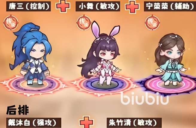 第一套推荐阵容由唐三、小舞、戴沐白、宁荣荣和朱竹清组成。这套组合具备双输出体系,整体爆发能力出色。小舞与朱竹清均为高单体伤害角色,技能释放精准且爆发力强,能够在集火目标时迅速将其击败。两人配合点杀战术,可有效清除敌方关键单位,大幅降低战斗难度。