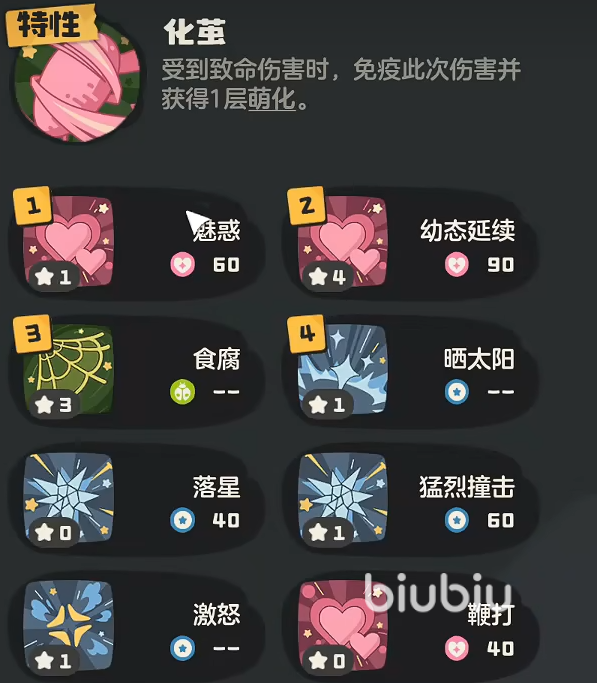 化蝶是游戏中颇具特色的精灵之一,外形融合了虫类特征与可爱元素,整体风格偏向萌系。其属性组合为虫与萌,属于双属性设定。从能力分布来看,该精灵在魔攻和速度两项核心指标上相对薄弱,因此在性格选择上应优先考虑能够提升这两个维度的类型,从而弥补基础成长上的不足,推荐选用增加魔攻或提高速度的性格方案。