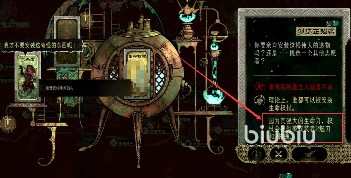 完成研究后,系统将自动触发“创造正强者”事件,允许玩家为自身或任意角色装配生命权杖。值得注意的是,在安装过程中,若角色的灵视属性超过5点,则可能引发幻痛负面效果,导致各项能力下降。此时必须使用生命之水解除异常,并卸下权杖以恢复正常状态。