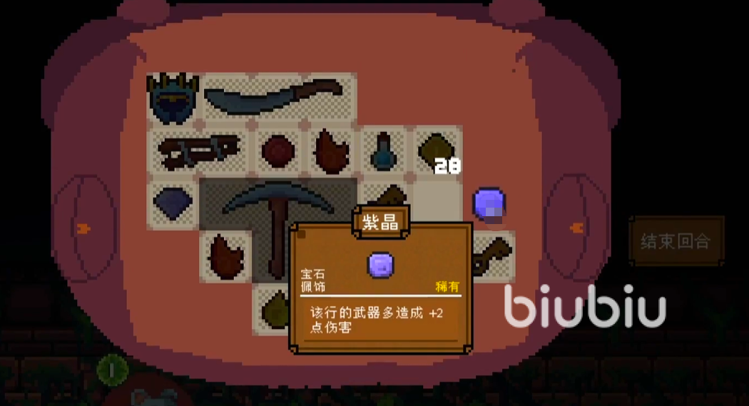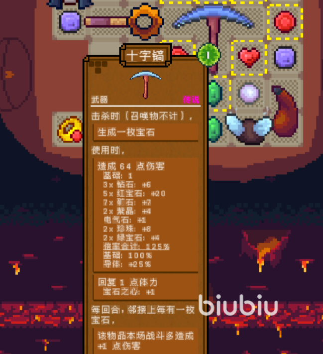 在背包英雄的核心机制中,玩家需合理规划有限的背包空间,通过排列不同尺寸的装备来最大化输出效率。十字镐以独特的T字结构占据四个格子,基础攻击力为64,在击败普通敌人后可自动生成一颗宝石,但对召唤单位无效。装备该武器后还会触发“宝石之心”效果,每场战斗结束时额外恢复1点体力值。更关键的是,当十字镐被放置于背包中心位置时,其相邻格子每存在一颗宝石,伤害就会提升1点。由于其自身能持续生成宝石,因此可形成“产宝石→增伤→更快清怪→更多宝石”的正向循环,非常适合用于高效清理小怪。