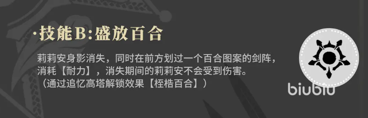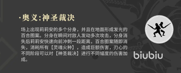她的第三个技能具备“间接突刺”机制,可视为一段快速突进技。施放时,莉莉安迅速向前冲刺,并在路径上对敌人施加破韧伤害。此技能常与后续的奥义大招衔接,形成流畅的连招组合。在释放终极技能时,她还能召唤出继承自身部分属性的分身协同作战,大幅提升整体输出强度。大招结束后,还可引爆累积的灵魂火种,释放出高额爆发伤害,完成一轮完整的技能循环。