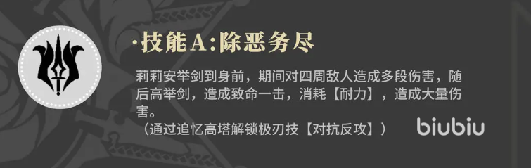 她的第一个技能名为“除恶务尽”,不仅能对前方区域内的敌人造成大范围挥砍伤害,还能在命中后额外触发一次终结式爆发攻击。该终结技并非主奥义技能,而是基于特定条件释放的重击效果,需在追忆高塔系统中解锁技能上限后方可完全发挥其威力。