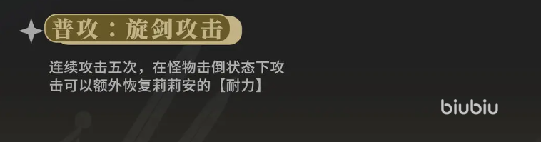 作为近战输出定位的角色,莉莉安在多种阵容搭配中都能担任主力输出位置。她的普通攻击拥有独特的“悬剑”机制,可在一次普攻中触发最多五次连续打击,相较于其他角色具有更高的攻击频率。这一特性让她在面对单体或群体敌人时均能保持高效的输出节奏。此外,若目标处于倒地状态,莉莉安在使用普攻时还能获得额外的耐力恢复,进一步增强了其持续作战能力。