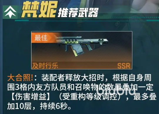 在武器配置方面,无需犹豫,首选“及时行乐”。该武器的被动效果与梵妮的技能机制高度契合——每当释放大招时,若周围三格内存在至少一名队友,即可叠加一层伤害增益,持续时间长达6秒。尤其在召唤单位密集、角色站位紧凑的情况下,一次技能可叠加多层增益,最终实现高达713%的攻击倍率,并叠加至满层10层,无论是挑战高难度BOSS还是清理精英怪,都能轻松应对。