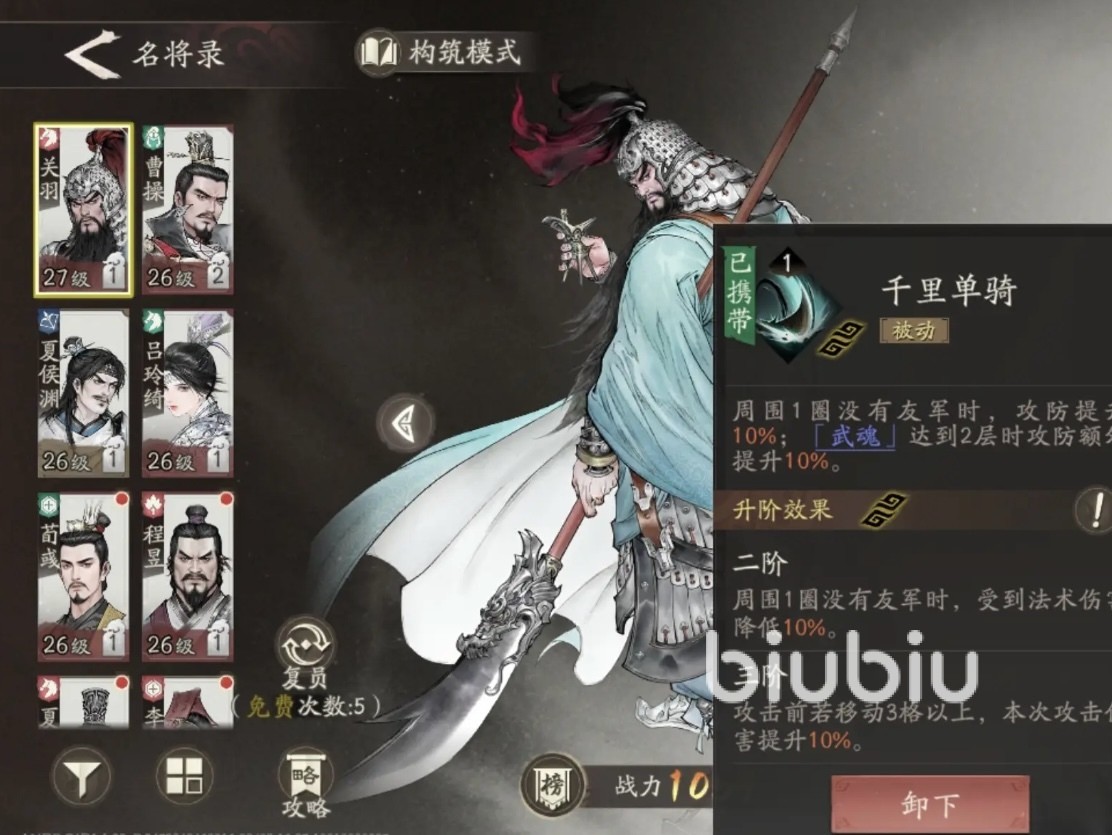 即使未能完成击杀,关羽也能施加“缴械”效果,使目标无法进行普攻。随着技能升级,在持有两层武魂的情况下仍可实现斩杀,此时所有技能冷却将被完全重置。满级状态下,关羽还可增加移动格数,并获得最高15%的额外伤害加成,输出能力极为可观。此外,若周围无友军单位,可额外提升10%的攻击与防御属性,且增益效果翻倍,适合孤军深入执行突袭任务。