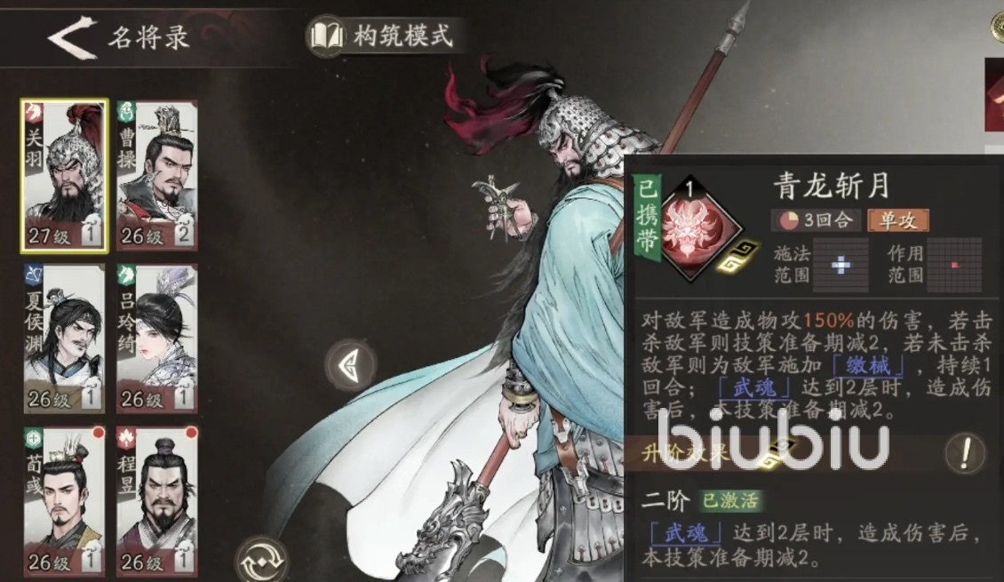 当关羽升至五星阶段后,武魂上限提升至三层,并额外获得对高生命值目标的增伤效果。若等级达到十级,在战斗初始即可携带两层武魂,具备极强的前期爆发力。配合多个技能之间的连贯衔接,以及命格系统带来的属性加成,整体作战优势十分突出。其核心输出技能“青龙”能对敌方单位造成50%的物理伤害,是主要的打击手段之一。