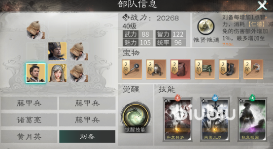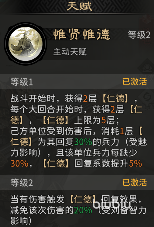 刘备的核心技能为“仁德”,具备出色的团队支援与反制能力。当己方单位受到攻击时,会消耗一层仁德层数,并恢复相应的兵力与生命值。同时,在刘备二阶技能解锁后,可使全队承受的伤害降低20%,显著提升整体生存能力。当该技能升至三级时,效果产生质变——不仅能继续保护队友,还能将“仁德”状态转移至敌方单位。每当友军被攻击,敌方目标便会叠加一层负面状态,最多累积四层。一旦叠满,敌人将陷入“罚站”状态,下一回合无法行动。这一机制有效遏制了依赖高频出手或爆发AOE的角色,打乱对手节奏,为我方创造反击良机。