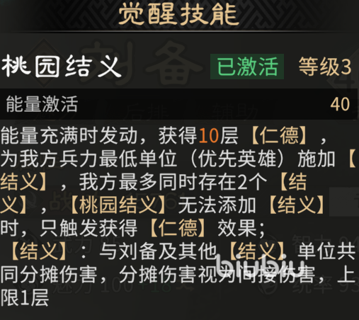 刘备的觉醒技能进一步强化了他的辅助定位。该技能可在战斗中快速生成大量仁德层数,解决前期积累缓慢的问题。此外,觉醒后还能为当前兵力最低的友军附加“结义”效果,使其分摊部分所受伤害。这项能力对脆皮输出角色尤为关键,极大增强了他们在高压环境下的存活率。通过觉醒技能的支持,刘备能够在关键时刻稳定战线,成为队伍中不可或缺的支撑点。