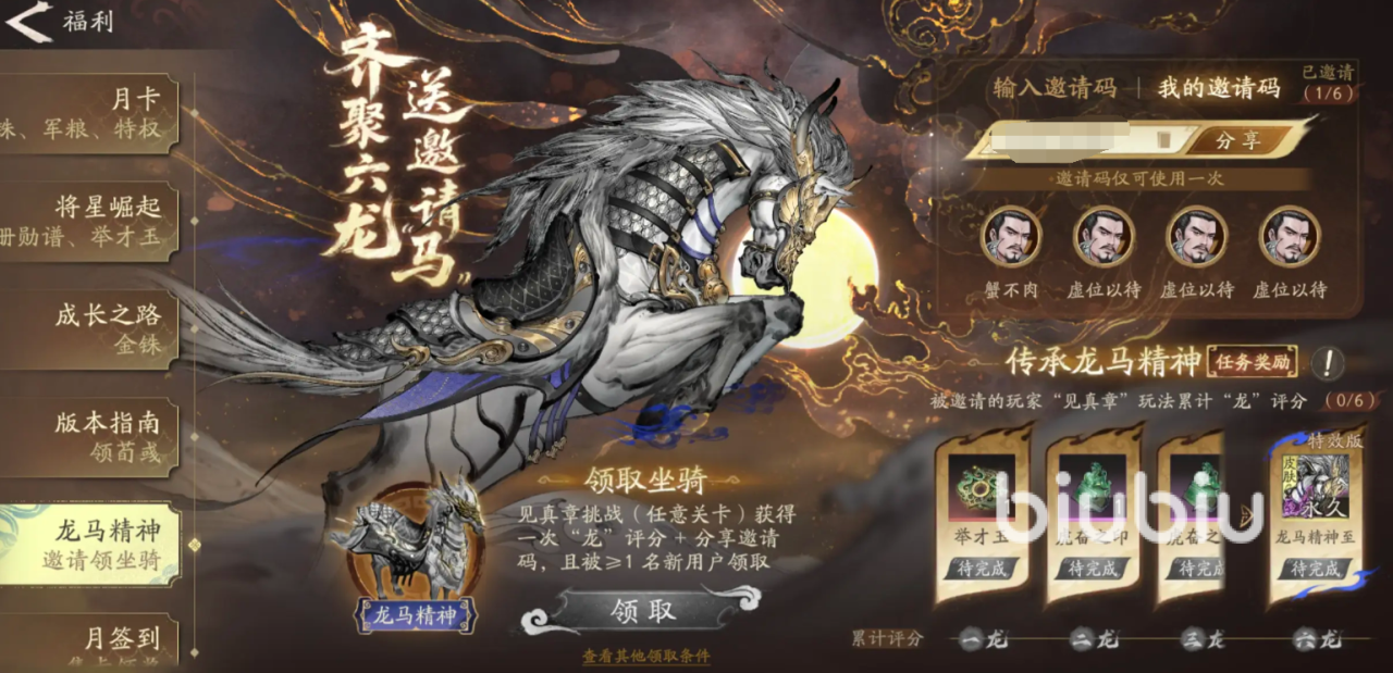 对于刚进入游戏的新手而言,“龙马精神”福利活动是不可错过的兑换机会。通过邀请好友加入游戏,可累积“龙”评分,当数量达到六个时,即可免费领取坐骑“龙马精神”。该坐骑属性优异,尤其适合搭配高输出类型的武将使用,提升整体战斗表现。