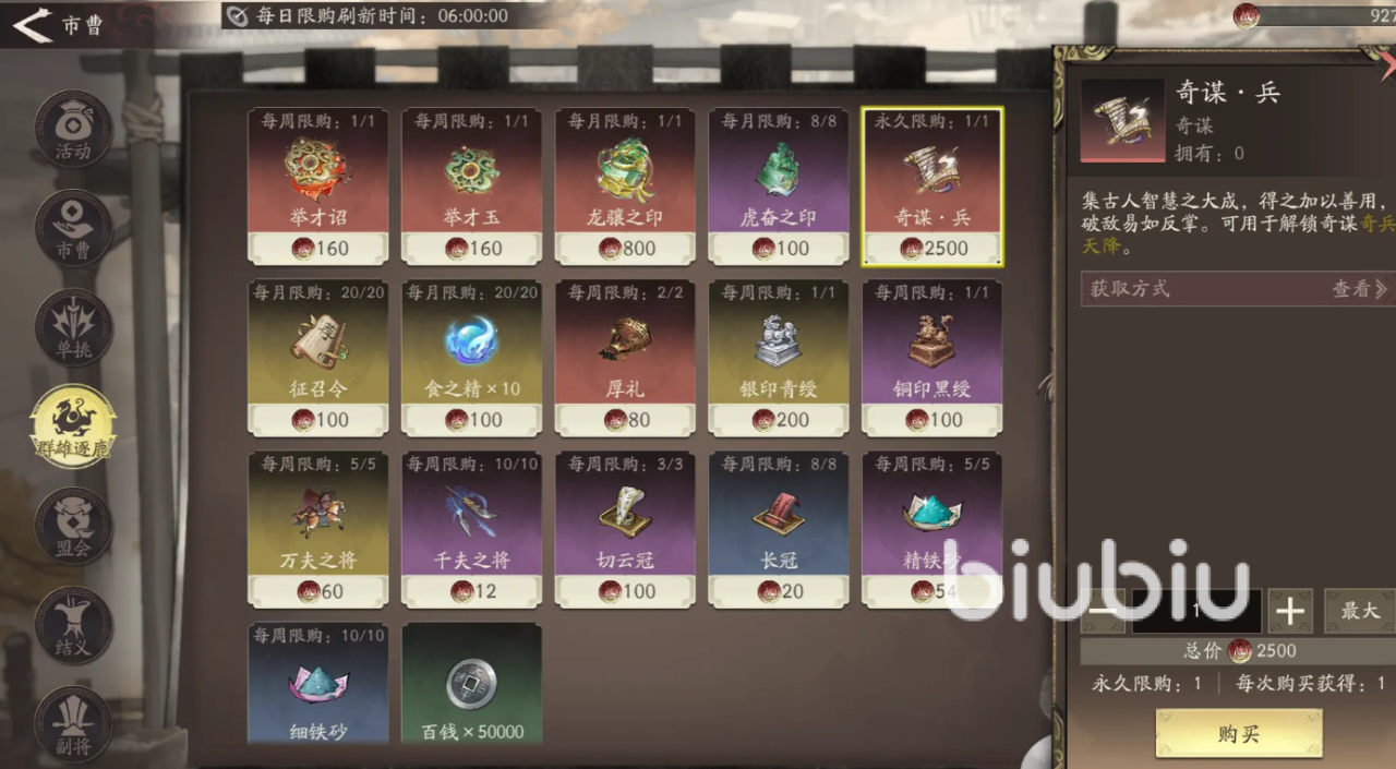 每周游戏都会开放限时商城,包括副将商店和市曹系统。玩家可通过收集副将碎片或使用市曹代币,换取所需的游戏物资,合理规划资源兑换路径至关重要。