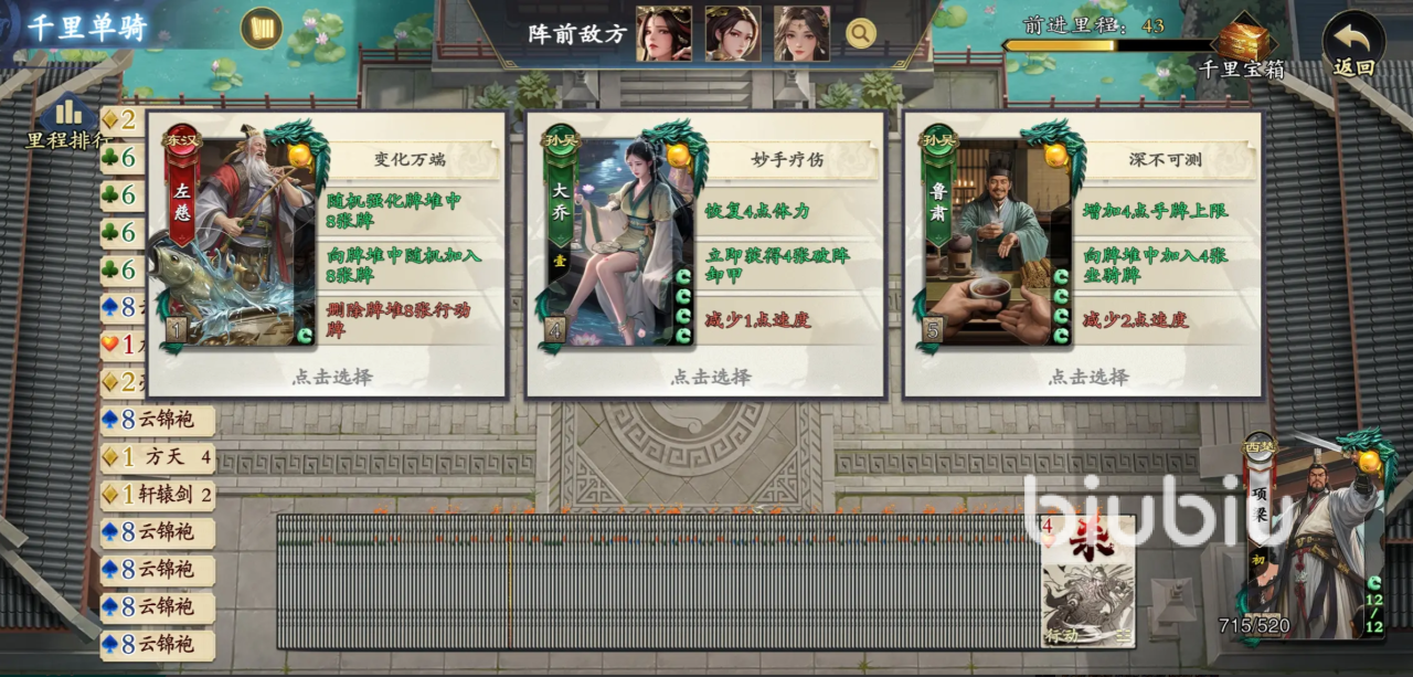开启“千里单骑”需要满足一个基础条件:拥有至少16名武将。虽然门槛不高,但这也意味着玩家必须熟悉各武将的特点,才能在单人出战的情况下发挥最大战力。与常规多人对战不同,此模式为单武将出征机制,仅可携带一名角色进行连续挑战,羁绊效果依然生效,但无法使用熔炼功能或变阵令,因此前期准备至关重要。每场战斗前,系统会提供三项增益规则供选择,合理组合这些加成,形成持续成长的优势,是决定挑战能否深入的关键所在。