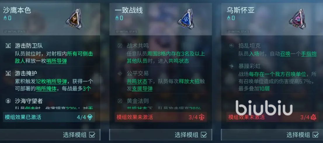 理解模组的激活规则是掌握属性加成的关键所在。每个编队仅可装备一枚模组,且必须确保队伍中拥有足够数量具备对应标签的角色。以沙鹰模组为例,需至少四名携带沙鹰标签的单位在场方可激活,缺一不可。玩家可在部署界面点击模组图标查看具体需求人数,并优先安排符合条件的角色入队,从而保障基础增益稳定生效。对于新手阶段而言,推荐优先选择沙鹰模组,因其初始赠送角色较多,达成激活条件更为轻松,能快速体验到团队强化带来的实战优势。
